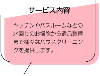 | キッチン+レンジフード分解清掃 | 浴室+トイレ1基+洗面+キッチン ※ レンジフード除く | 浴室+トイレ1基+洗面+キッチン ※ レンジフード除く | キッチン・レンジフード分解清掃・バスルーム トイレ1基・洗面所・窓・サッシ・畳(水拭き) 照明(シャンデリア除く)・床(水拭き) 玄関・廊下・各部屋・水回り除菌抗菌 | 仕分・廃棄・簡易清掃 | 故人様の愛用品の回収及びご供養(サイズ:500×330×200mm) |