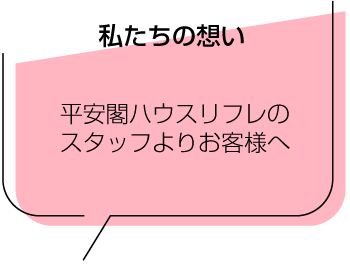私たちはお客様から「ありがとう」と仰っていただくことが一番の喜びです。平安閣ハウスリフレは単なるサービスではなく、お客様に寄り添い心のふれあいを大切にします。そしてお客様がリフレッシュでき、さらに健康になっていただくことが一番の目標です。